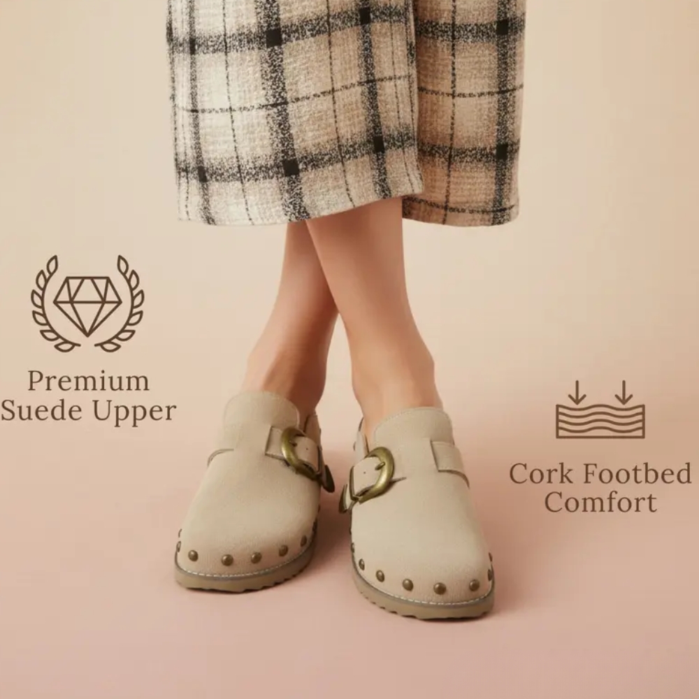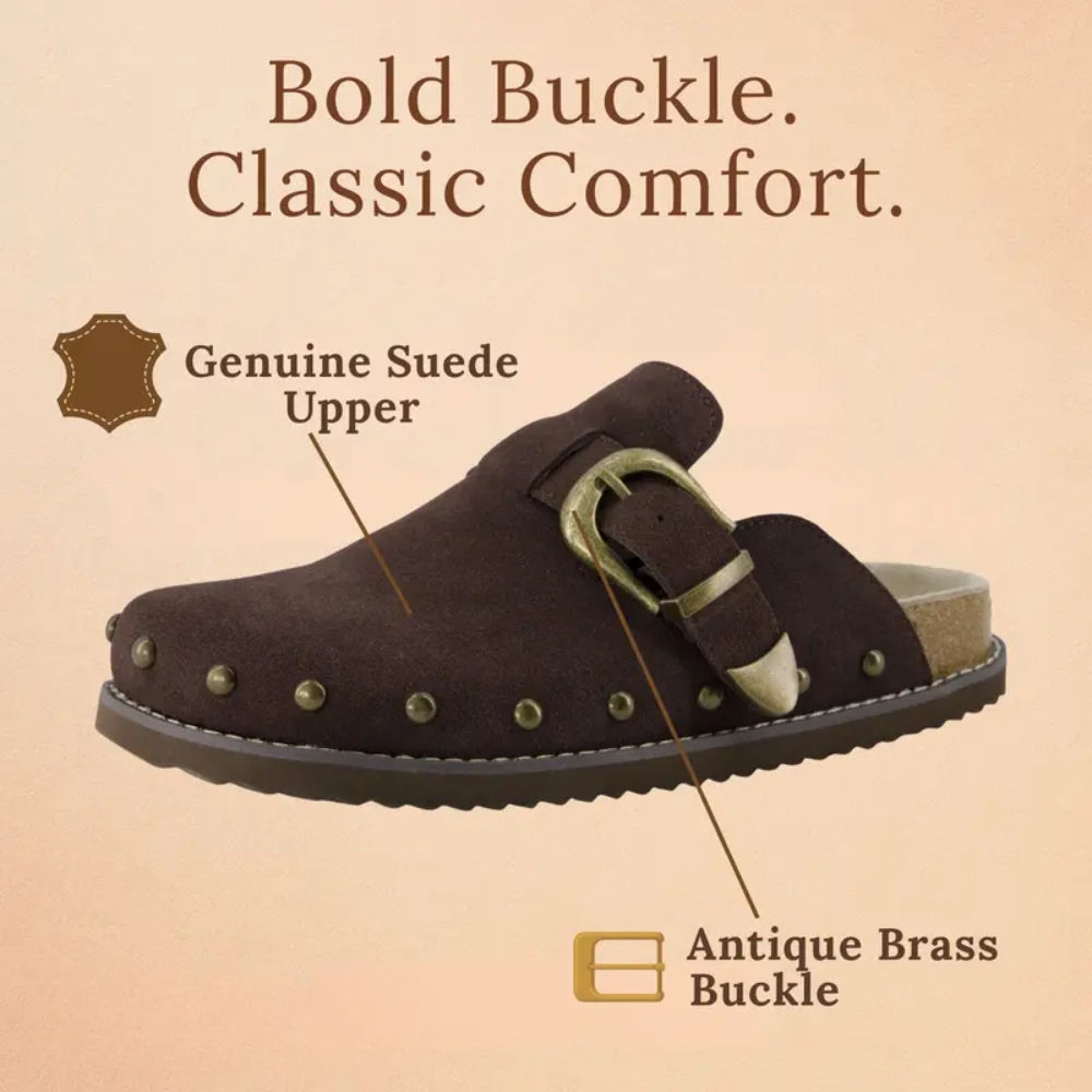 The Suede Studded Clogs Women deliver a balanced combination of bold detailing and everyday functionality. Featuring a genuine suede upper, antique brass buckle, studded trim, and memory foam cushioned insole, they offer a structured design with comfortable wearability.